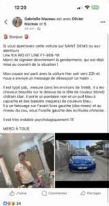 Toute personne ayant aperçu cette voiture ou correspondant au signalement dans le secteur de Saint-Denis et ses alentours est invitée à contacter immédiatement la gendarmerie.