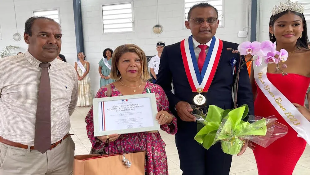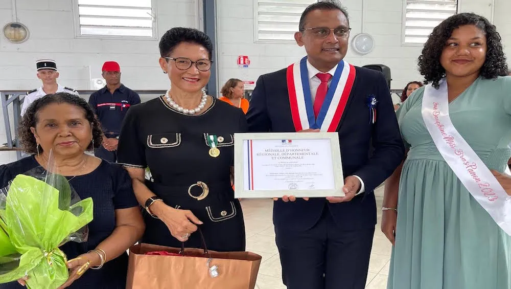 De gauche à droite : l’adjointe au maire Marie-Andrée Damour, Christine Garsany (Médaille d’Or), Jeannick Atchapa et Maïlys Hagen, 2ème dauphine Miss Bras-Panon 2023.