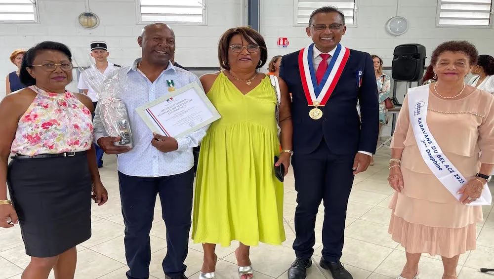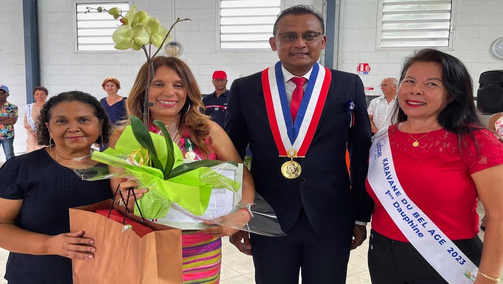 De gauche à droite : l’adjointe au maire Suzie Célémani, Jean-Michel Banon (Or), son épouse, le maire Jeannick Atchapa et la 2ème dauphine de la Miss Karavane du Bel Age.