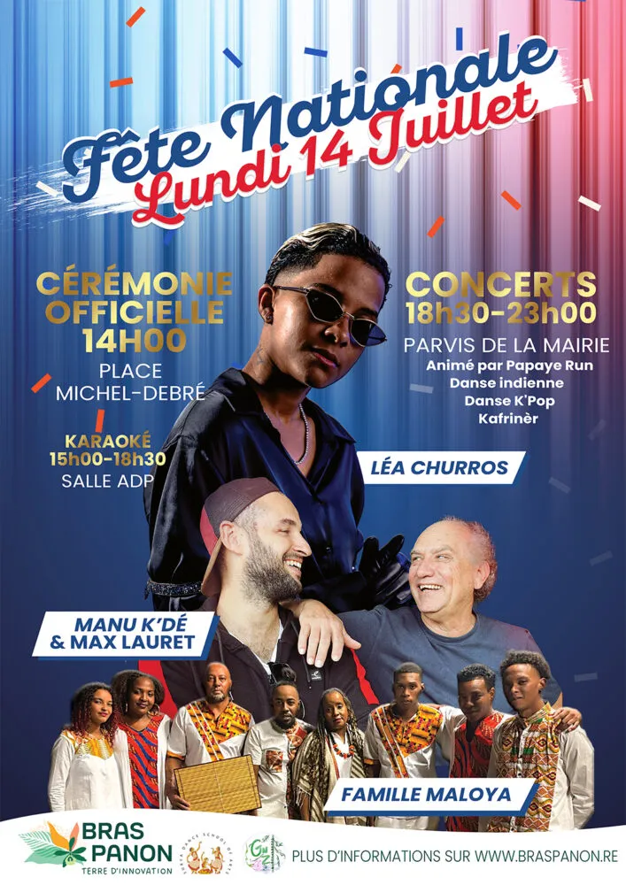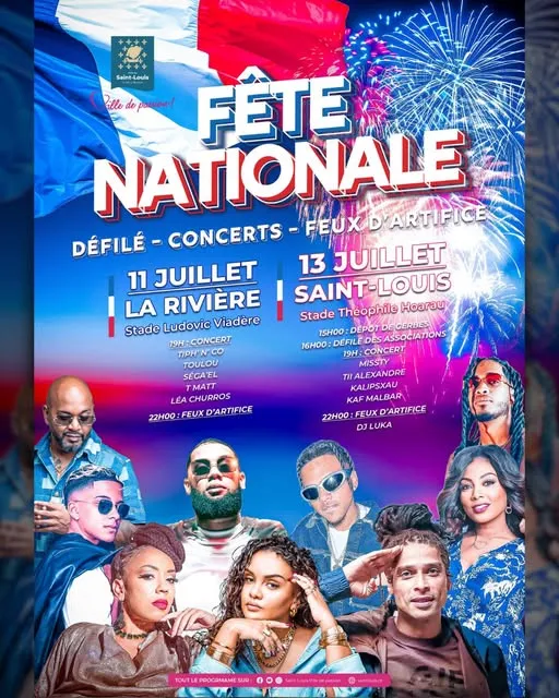 • Le 13 juillet à Saint-Louis, cérémonie officielle à 15h, défilé à 16h et concerts dès 19h avec Missty, Tii Alexandre, Kalipsxau et Kaf Malbar. Le feu d’artifice clôturera la soirée avant un set de DJ Luka.