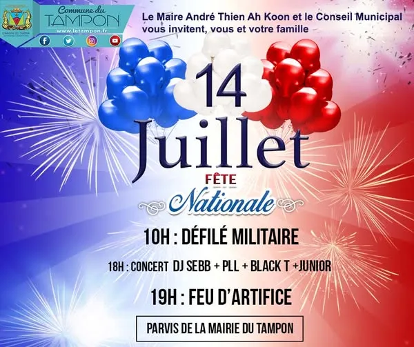 Direction le Parvis de la Mairie pour une soirée qui s’annonce électrique. Dès 18h, DJ Mrick ouvrira les festivités, suivi d’un concert live de Barth à 19h30. À 19h, le traditionnel feu d’artifice illuminera le ciel du Tampon avant de laisser la place à DJ MG pour faire danser le public jusqu’au bout de la nuit. Une soirée à partager en famille ou entre amis !