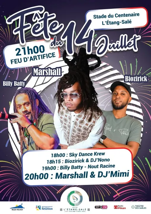 Dès 18h, la ville de L’Étang-Salé vous donne rendez-vous au stade du Centenaire avec Sky Dance Krew, Biozirick & DJ’Nono, Billy Batty, Marshall et DJ’Mimi. Le feu d’artifice est prévu à 21h pour conclure cette soirée festive.