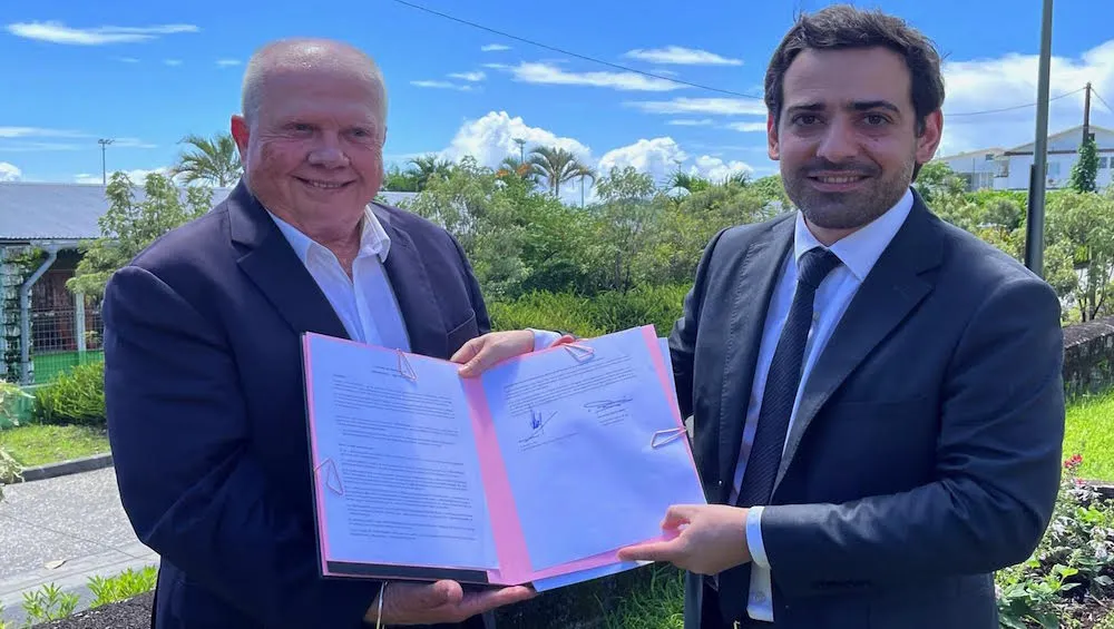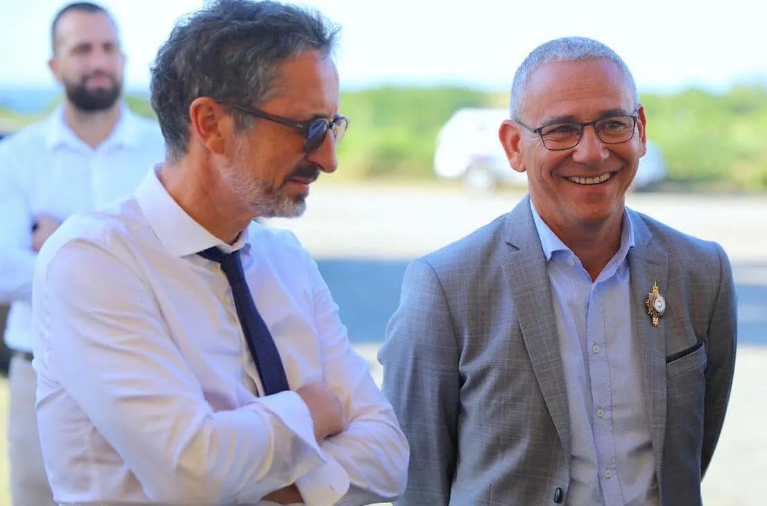 Joé Bédier (avec la veste grise) en compagnie du préfet Jérôme Filippini. (Crédit photo : service Com’ mairie de St-André)