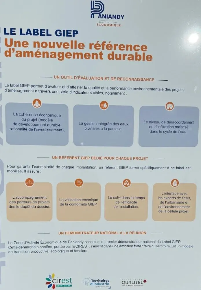 Porté par la Cirest, en partenariat avec l’association Qualitel, la Semac, Elleny, Action Logement, la Banque des Territoires et la Région Réunion, le label GIEP s’inscrit dans une volonté forte d’adaptationaux changements climatiques. « Il vise à généraliser une gestion durable et intégrée des eaux pluviales dans les projets d’aménagement, à travers des techniques d’inflitration, plus économiques et plus résilients », a précisé François Outin. La Zone d’Activités Economiques de Paniandy, démonstrateur opérationnel du label, devient ainsi un projet pilote à l’échelle de notre île.