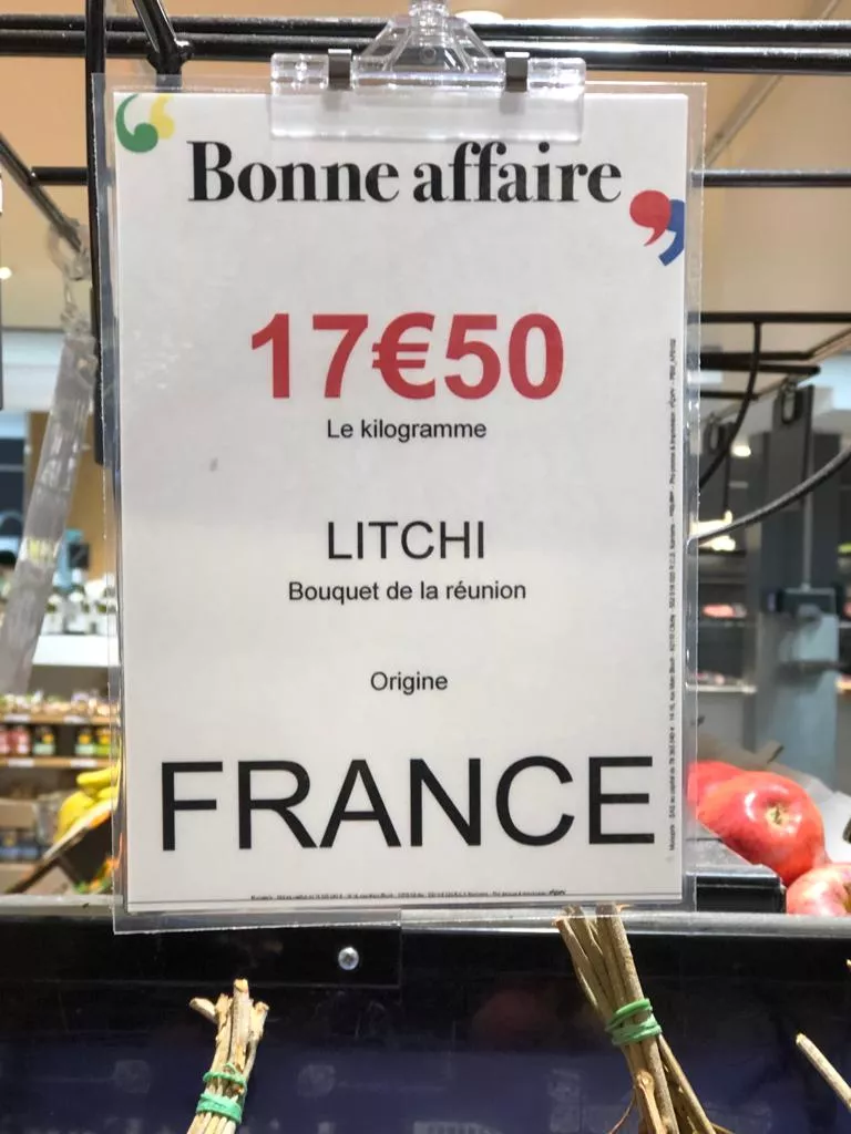 Deux petits clichés qui m’ont été envoyés hier soir par une amie résidant en métropole. Photos prises dans un supermarché du 6ème arrondissement à Paris. Ça fait quand même un peu cher pour des letchis qui, de surcroît, ne sont pas tous frais en raison du transport (plus de 10 000 km). Vous me direz que « la Réunion, ça se mérite » ou encore « le goût oté ! » mais pour l’image de notre île, nos producteurs auraient pu faire un effort et envoyer des fruits un peu plus présentables et non pas ces letchis « rikiki » et encore verts. Heureusement qu’ils vendent pas des bichiques à Paris !