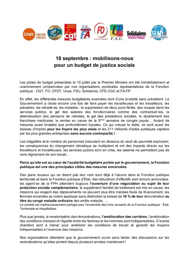 Elles invitent les agents et l’ensemble de la population à se mobiliser massivement le 18 septembre pour exiger « un budget de justice sociale » et rappeler leur attachement à un service public fort, garant de l’égalité et de la solidarité.
