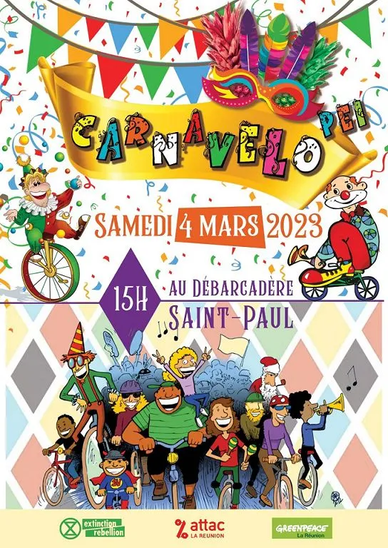 Ce samedi 4 mars les collectifs et associations Extinction Rebellion, Attac Réunion, Greenpeace La Réunion, organisent le 1er Carnaval à Vélo de l’île de La Réunion sur la commune de St-Paul ! Le rendez-vous est donné à 15h au niveau du débarcadère de la ville de St-Paul.