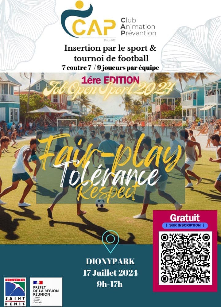 Le Club Animation Prévention (CAP) est fier d’annoncer la première édition du « Job Open Sport 2024 ». Cet événement exceptionnel, axé sur l’insertion par le sport, se tiendra le 17 juillet 2024, de 9h à 17h, au Dionypark. Au cœur de cette journée, un tournoi de football 7 contre 7 réunira des équipes composées de 9 joueurs chacune. Ce tournoi est une occasion unique de célébrer des valeurs essentielles telles que le fair-play, la tolérance et le respect. Les participants auront l’opportunité de se confronter dans une ambiance conviviale et de se dépasser, tout en favorisant l’inclusion sociale et professionnelle. L’inscription est entièrement gratuite. Pour participer, il suffit de scanner le QR code présent sur l’affiche de l’événement. ![]()