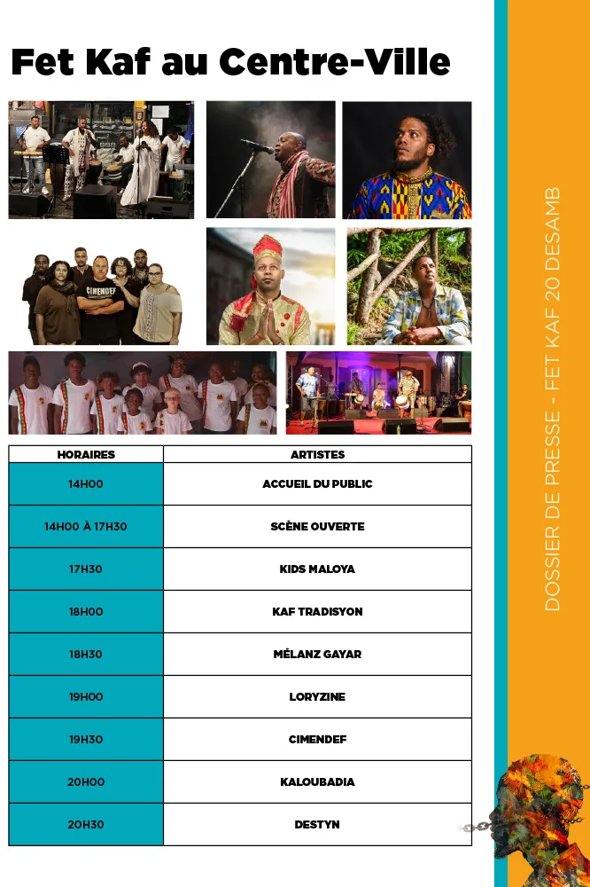 – Dès 19h30, place au grand concert avec les artistes : DESTYN, KALOUBADIA, CIMENDEF, LORYZINE, MÉLANZ GAYAR, ZÉPHIR GAYAR A NOU, KAF TRADISYON.