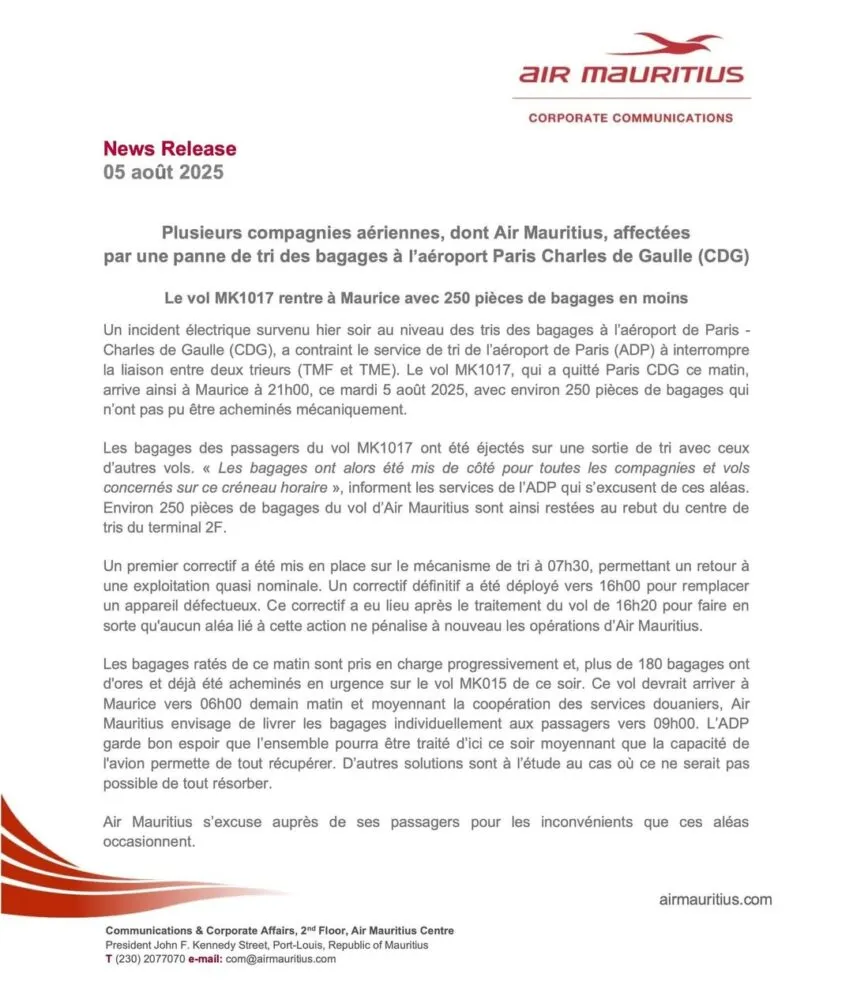 Un dysfonctionnement électrique majeur survenu dans la nuit du 4 au 5 août 2025 dans les systèmes de tri des bagages de l’aéroport Paris Charles de Gaulle (CDG) a lourdement impacté plusieurs compagnies aériennes, dont Air Mauritius. L’incident a contraint les services d’ADP à suspendre temporairement les connexions entre les trieurs TMF et TME du terminal 2F, forçant une gestion manuelle partielle.