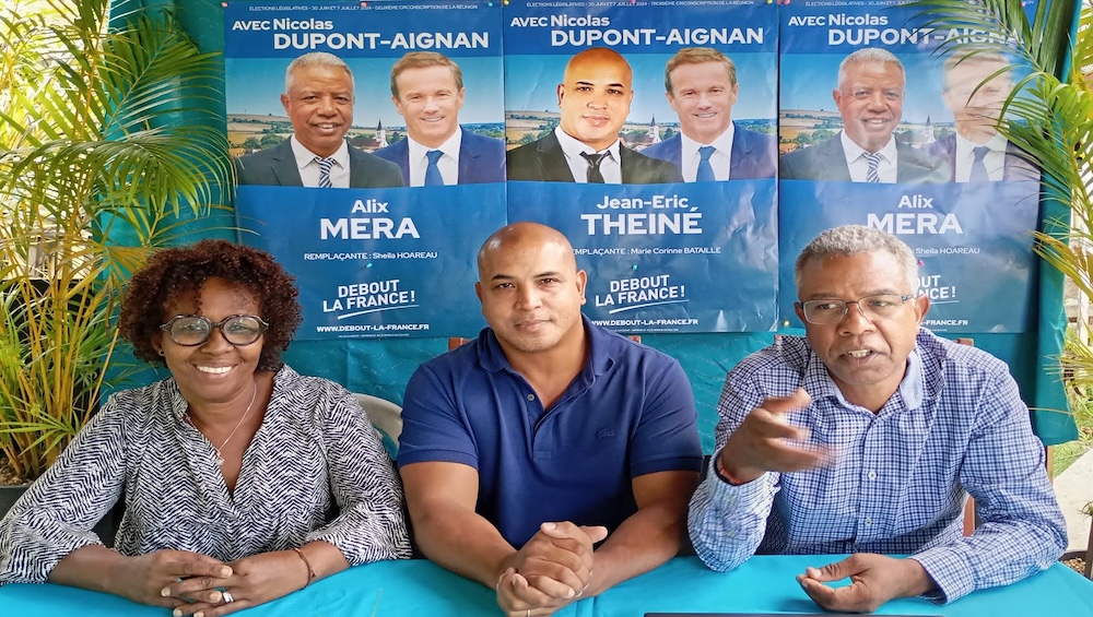 « Rejoignons Nicolas Dupont-Aignan » : c’est avec cette étiquette que Alix Mera et Jean-Eric Theiné se présentent respectivement dans la 2ème et 3ème circonscription aux législatives anticipées. Alix Mera a comme suppléante Sheila Hoareau. Corinne Bataille sera celle de Jean-Eric Théiné.