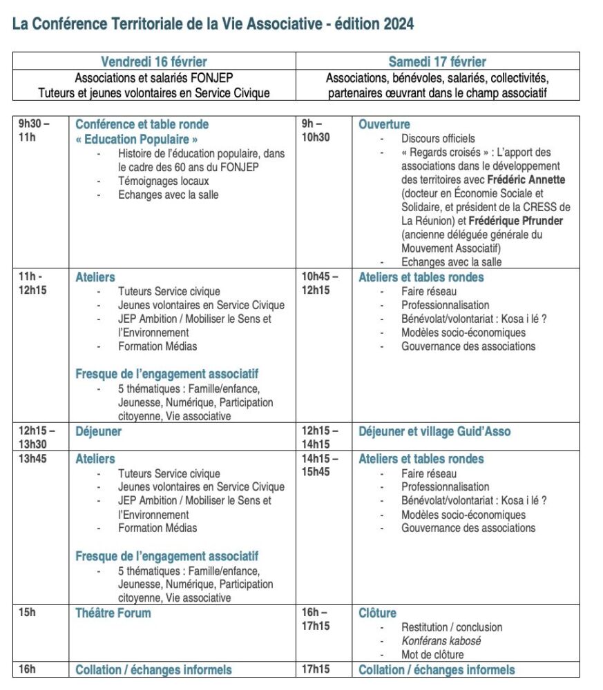 Sont prévus des échanges sur l’engagement, l’éducation populaire, la gouvernance, la mise en, réseau, les modèles socio-économiques et la professionnalisation du monde associatif, notamment. La Conférence Territoriale Vie Associative concerne tous les partenaires œuvrant en faveur du développement des associations réunionnaises, dont les bénévoles.
