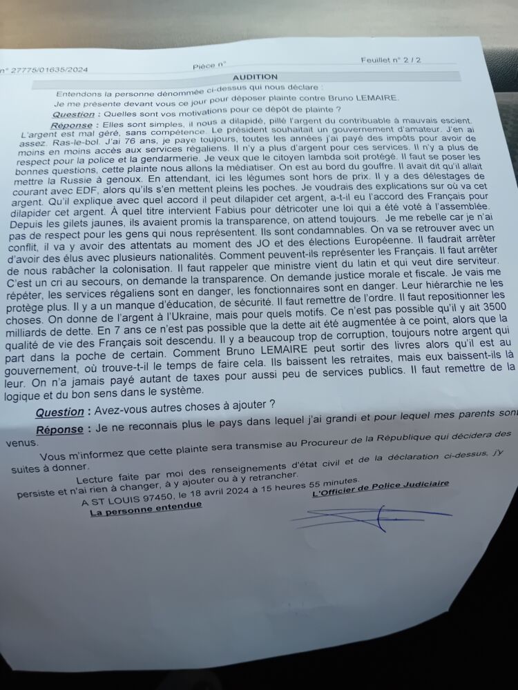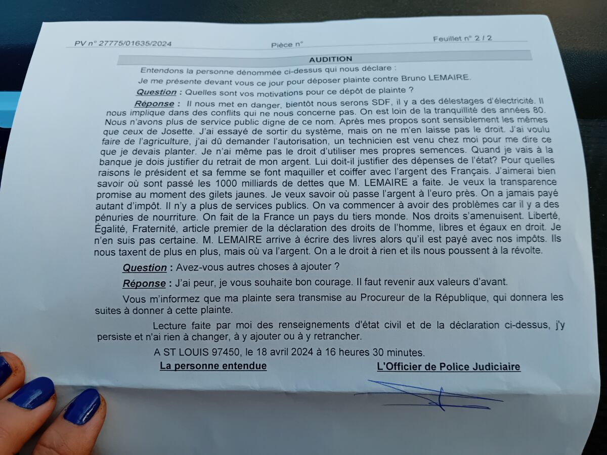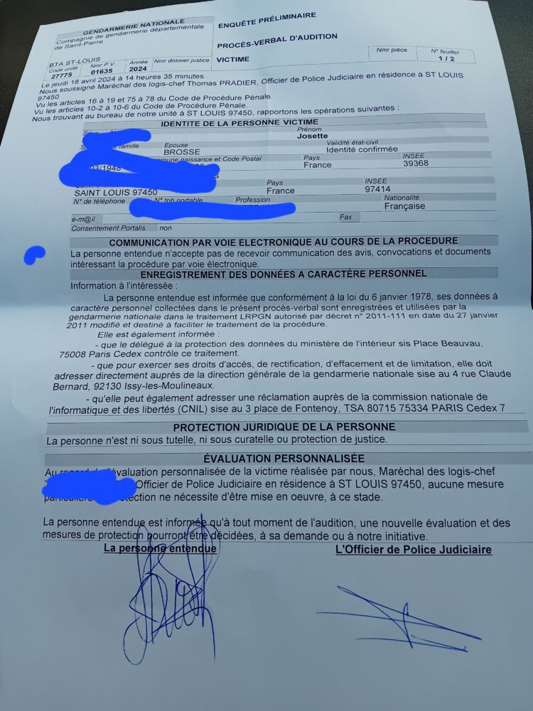 J’ai reçu ce mail hier soir. Je partage avec vous. «Voici les copies de nos plaintes déposées ce jour, jeudi 18 avril 2024 auprès des gendarmes de Saint-Louis. En effet, lors des GJ (Gilets Jaunes), nous avions demandé une transparence qui a été promise par Annick Girardin, alors ministre des Outre-mer.