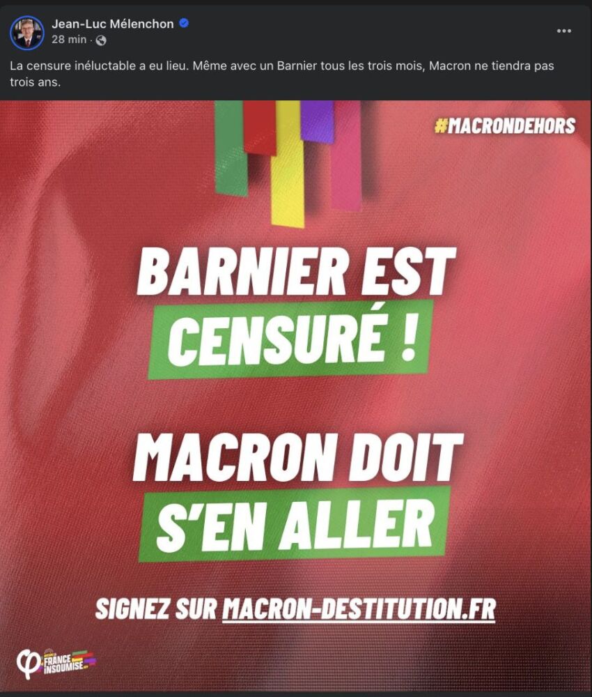 « Barnier est censuré, Macron doit s’en aller ! Aujourd’hui en censurant ce gouvernement illégitime, l’Assemblée nationale a soldé les comptes de la macronie : des gilets jaunes à la réforme des retraites, de la dissolution au non-respect du résultat des élections.