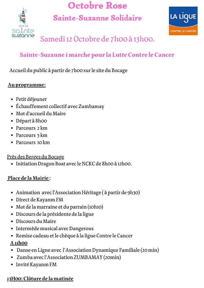 La ville de Sainte-Suzanne en partenariat avec la Ligue Contre le Cancer organise sa 3ème édition « Octobre Rose » avec plus de 600 inscrits pour la marche rose ce :