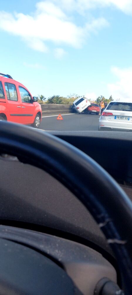 Cet après-midi, un accident spectaculaire impliquant deux véhicules s’est produit sur la quatre voies de Saint-André, en direction de Saint-Benoît, près de la station Vito. La voie de gauche est neutralisée, entraînant d’importants ralentissements. Une voiture est même montée sur l’autre. Prudence sur la route !