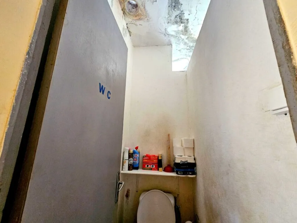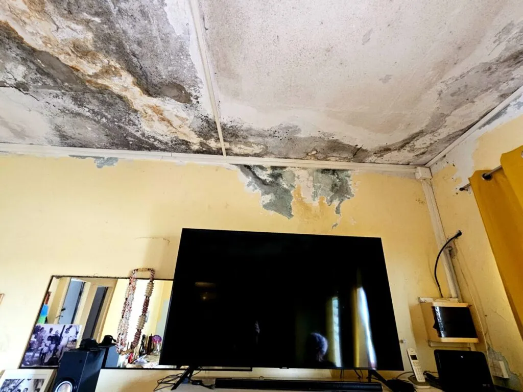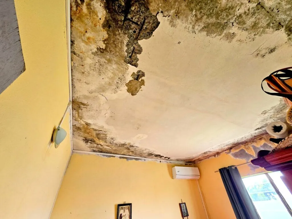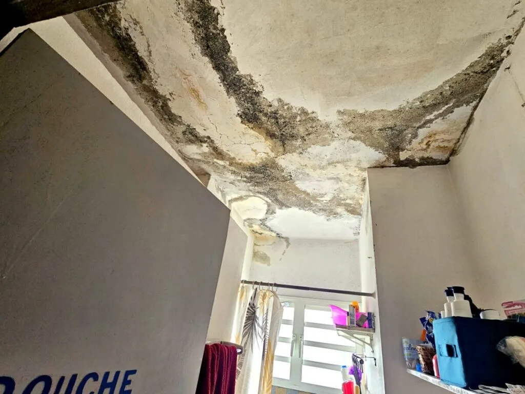Dès l’entrée, l’humidité saisit comme une gifle silencieuse. L’air est lourd, moite, presque irrespirable. Des seaux, des bassines et même des casseroles sont éparpillés dans chaque pièce, témoins silencieux d’un combat quotidien contre les infiltrations. Le toit, affaissé par les années et les intempéries, laisse passer l’eau à chaque averse. Les murs suintent, couverts de taches sombres et de moisissures qui grignotent lentement la structure. Les meubles, autrefois solides, sont aujourd’hui rongés par l’humidité, gonflés, déformés, parfois inutilisables. Le sol est glissant, les rideaux imprégnés d’eau, et l’odeur de moisi imprègne chaque recoin.