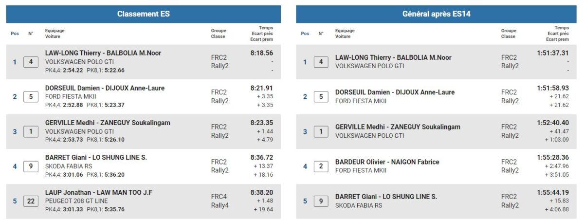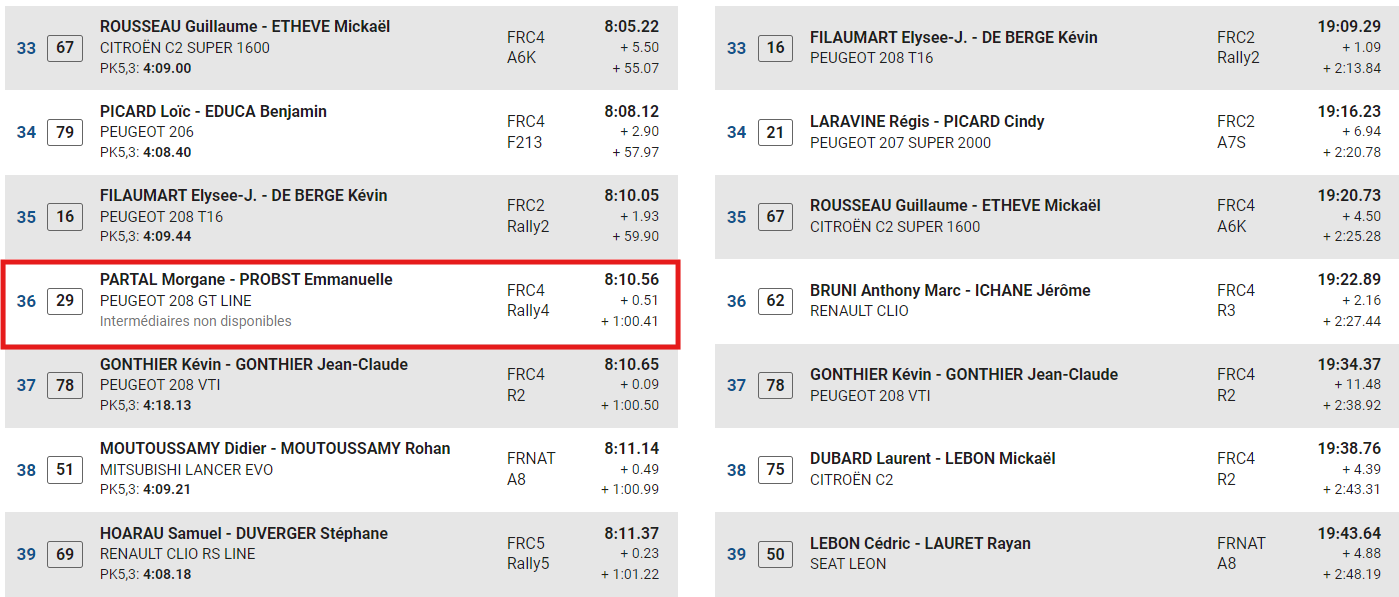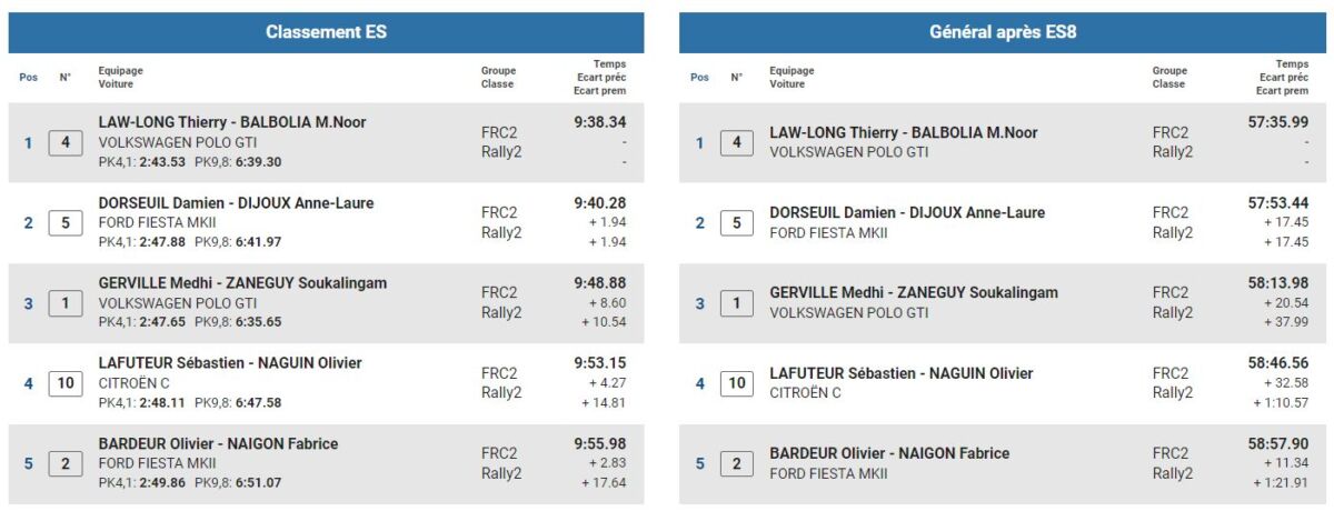 A l’issue de la huitième épreuve spéciale, Thierry Law-Long mène la course. Il se trouve plus d’une seconde sur Dorseuil Damien. La team Partal reste toujours à la 36e position, et est toujours en course