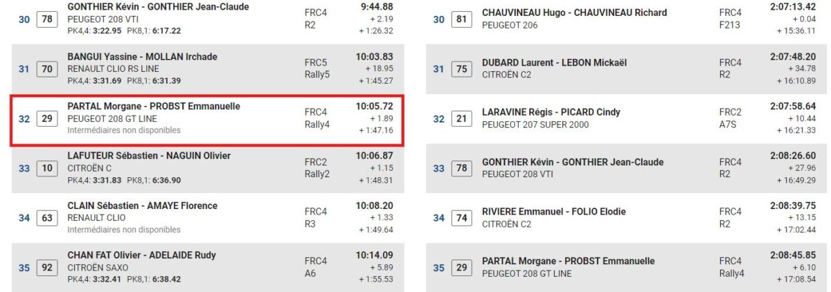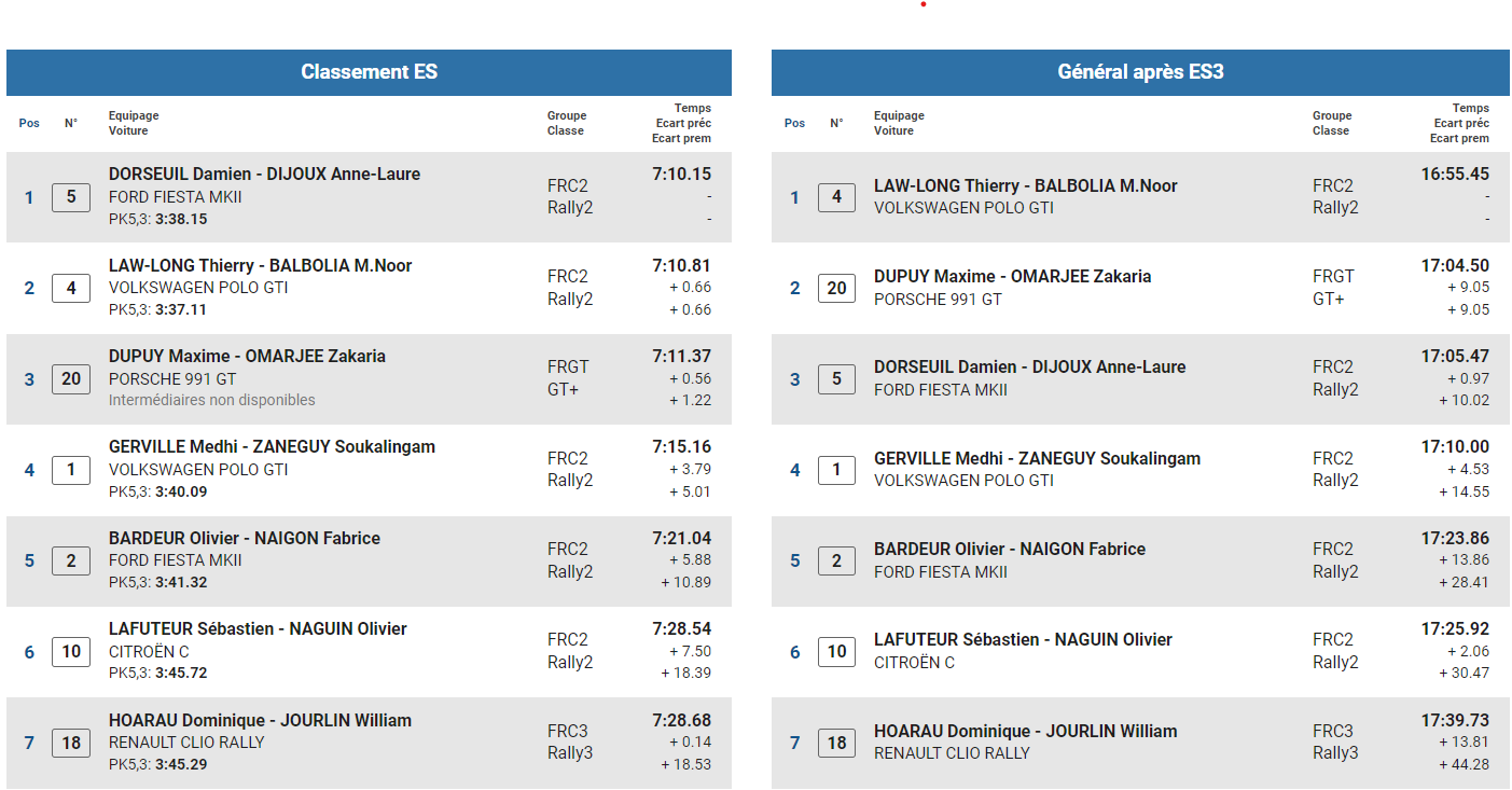 Après les trois épreuves spéciales de la première journée, la voiture Free Dom de la Team Partal se trouve 34e au classement général alors que Dupuy Maxime reste en tête :
