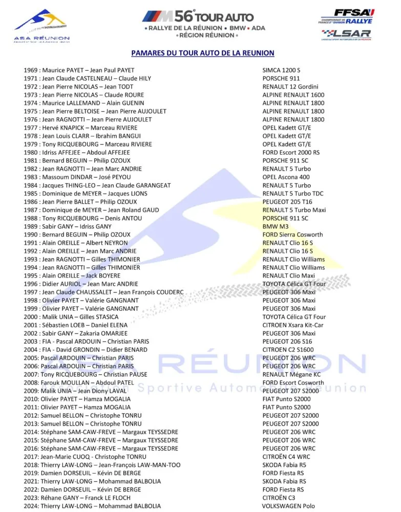 Le Tour Auto, 56eme édition a été remporté par Réhane Gany. Morgane Partal termine à la 26ème place, et Olivier Chan Fat juste derrière à la 27ème sur 54 arrivées.