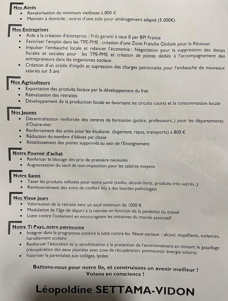 Le mot de la fin est revenu à la candidate Léopoldine Settama-Vidon, qui a insisté sur les points forts de son programme, à découvrir ci-dessous :
