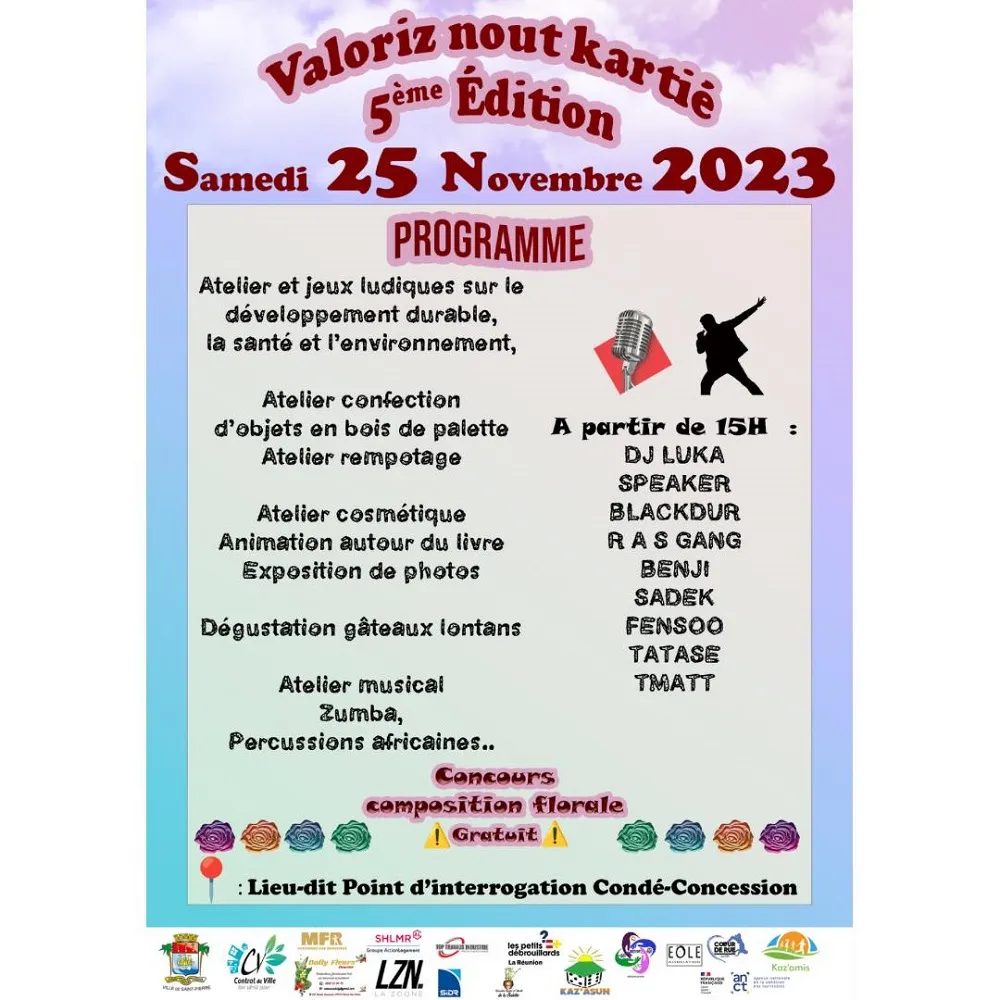 Envie de passer un bon moment en famille ou entre amis le samedi 25 novembre ? Venez participer à la 5ème édition de Valoriz nout kartié, à partir de 09h. Cet événement est gratuit et ouvert à tous, alors n’hésitez pas à inviter vos proches !