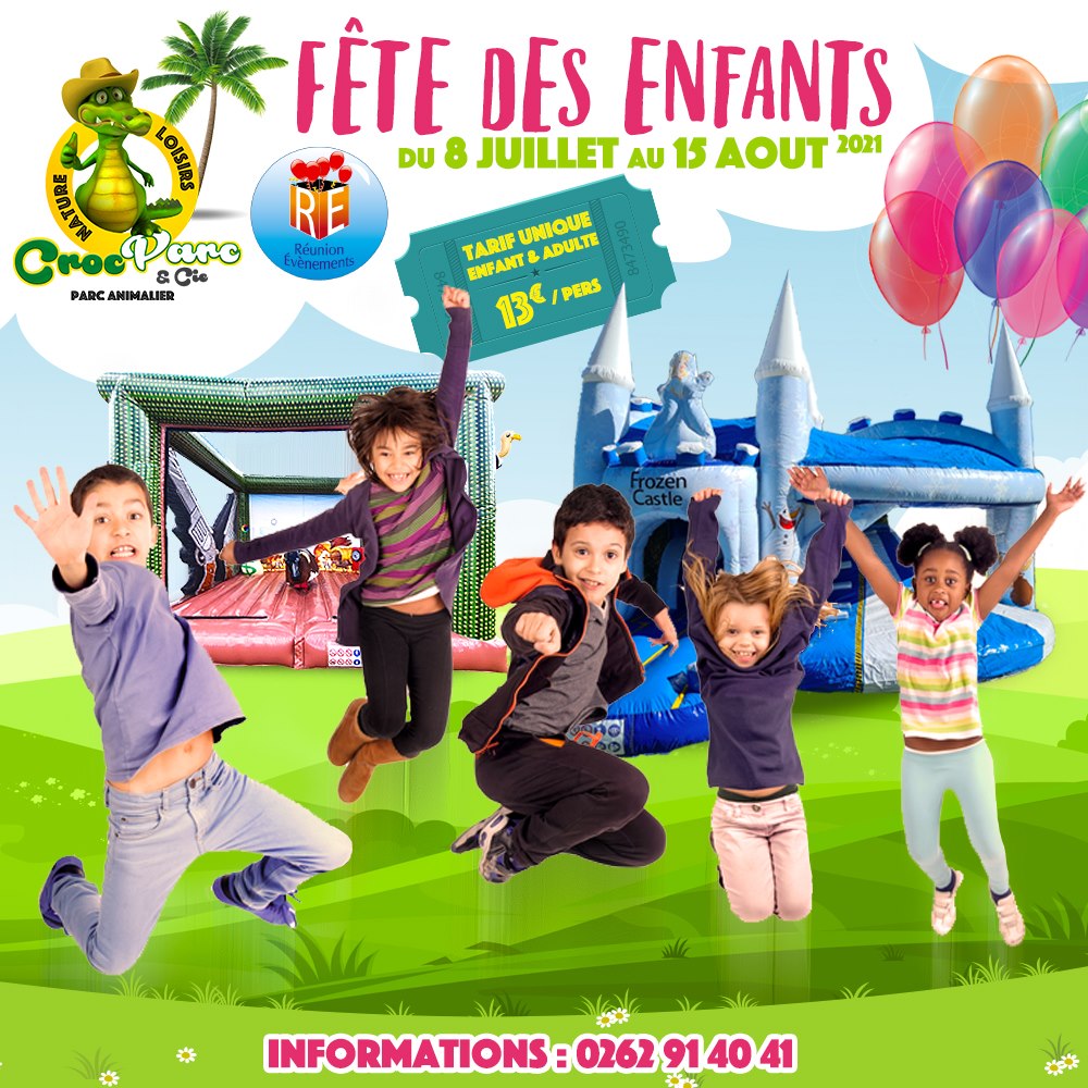 Du 8 juillet au 15 août 2021, Réunion Évènement et CrocParc s’associent pour vous proposer « La fête des enfants ». Au programme structures gonflables, balade en quad (3€ le tour), snack ouvert, pique-nique autorisé et surtout des tortures, des lémuriens, iguanes, paons, chameau et dromadaire, lama, poney, oiseaux, chèvres, canards, lapins, cobayes et des crocodiles qui vous attendent tous les jours de 10h à 17h !
