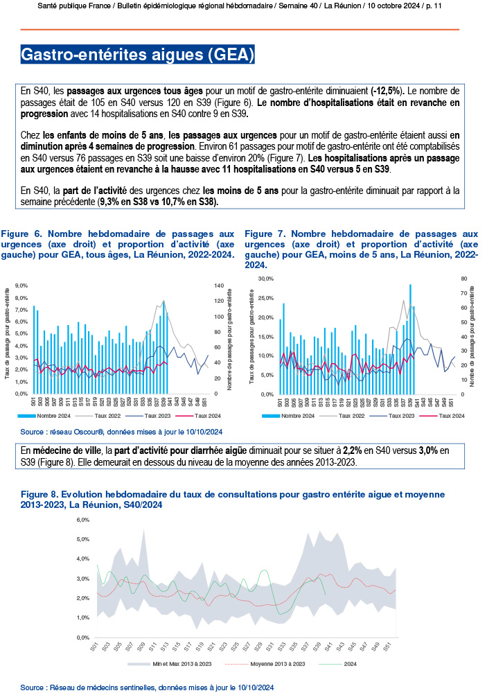 - Gastro-entérites aigues (GEA) : Baisse des passages aux urgences tous âges confondus et chez les moins de 5 ans.