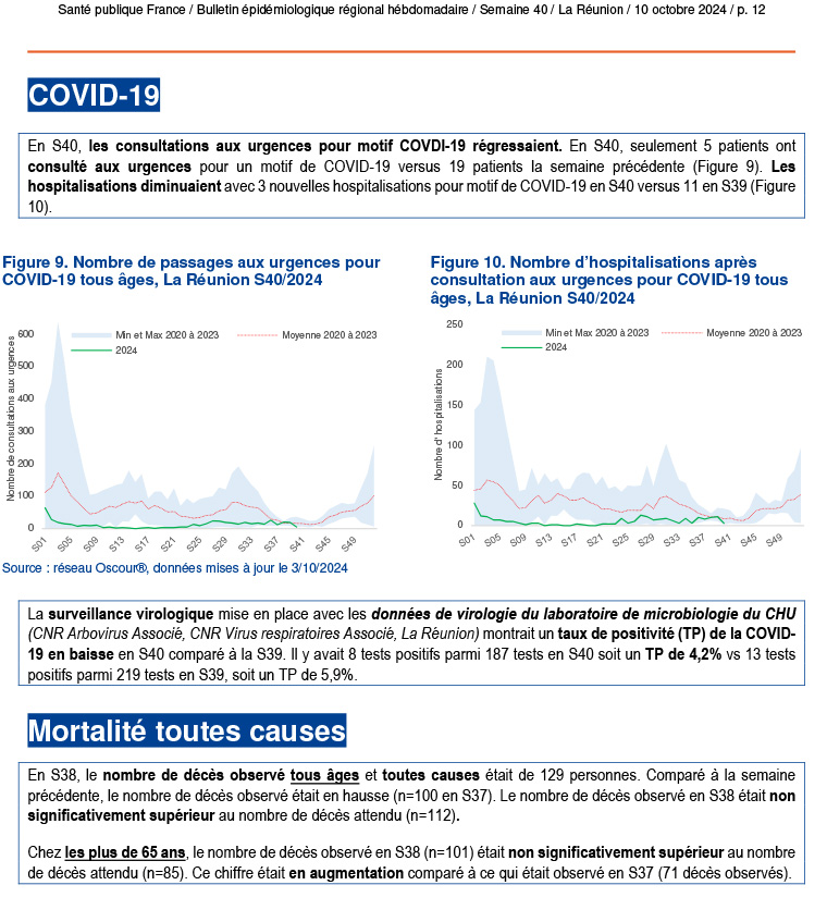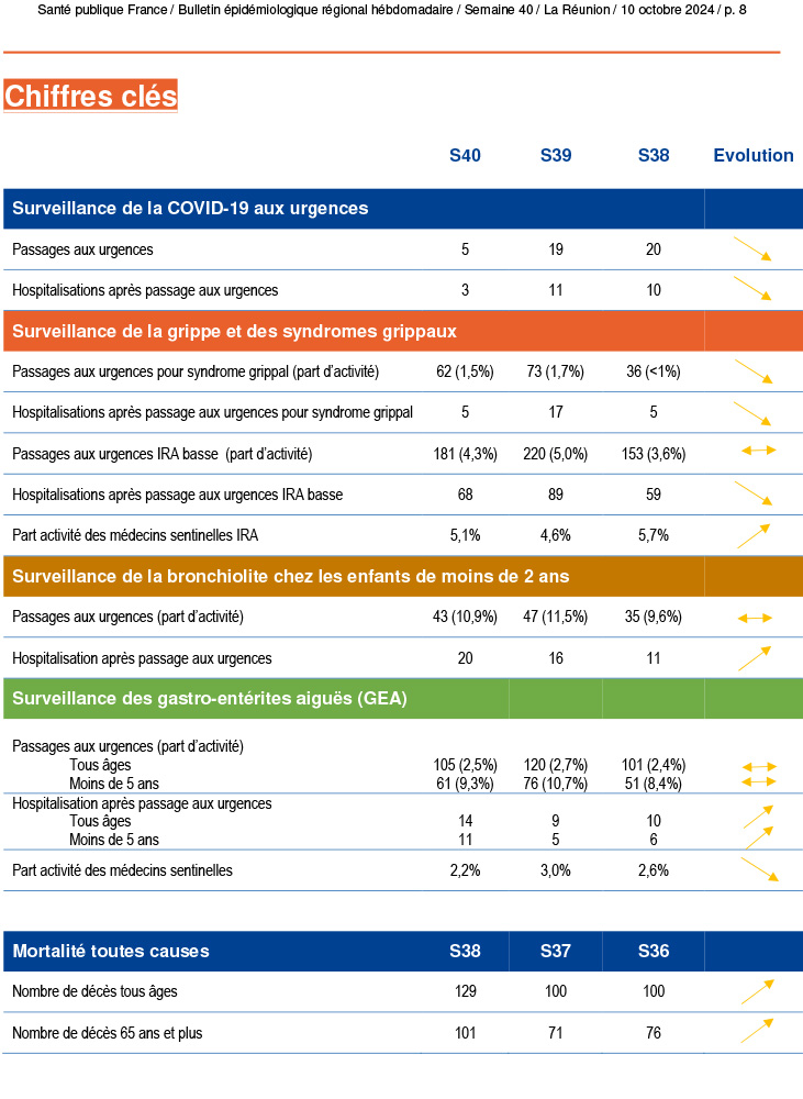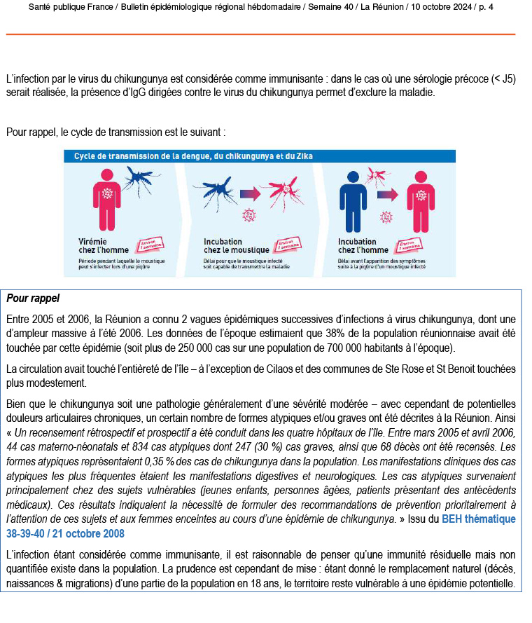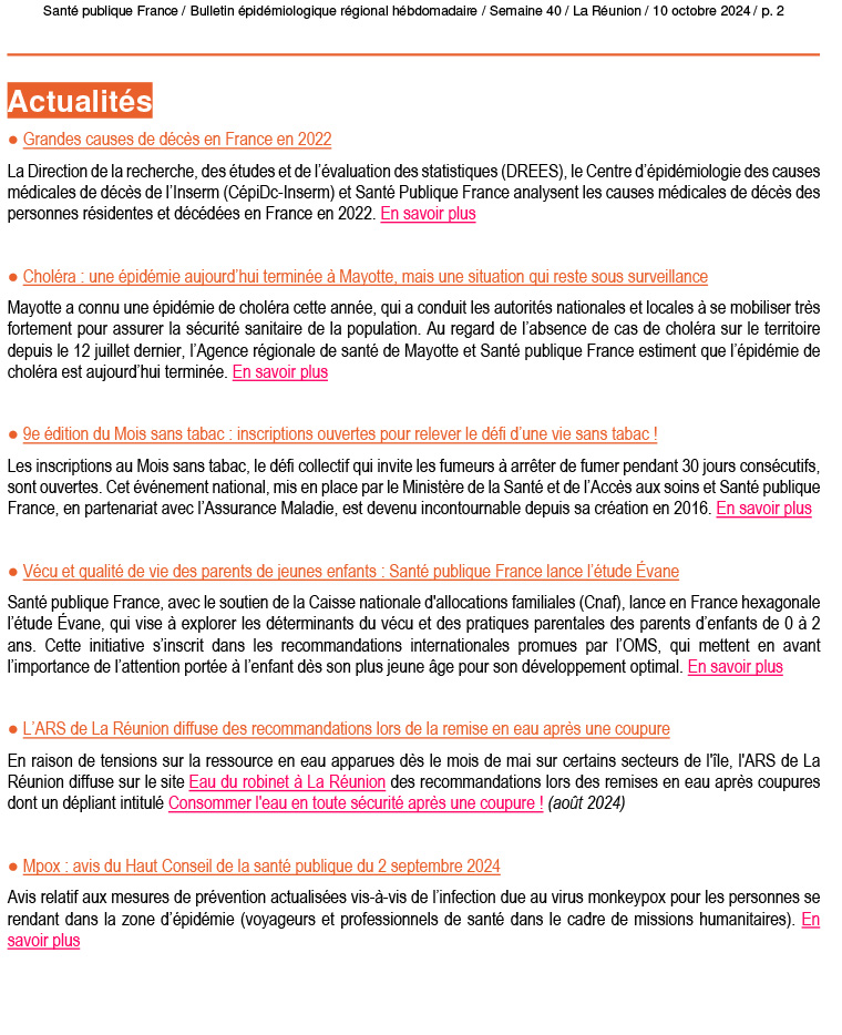 - Chikungunya : 9 cas autochtones de chikungunya confirmés dans l’ouest regroupés en un foyer de 7 cas. Les 2 autres cas, proches géographiquement, ne sont pas liés à ce foyer.