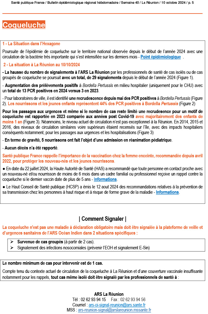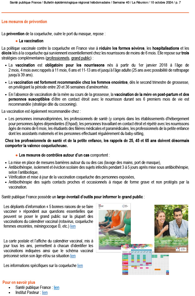 - Coqueluche : Impact sanitaire limité qui touche essentiellement les nourrissons et les jeunes enfants.