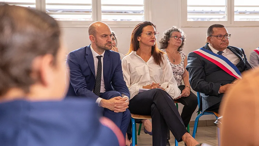 Jean-Noël Barrot, Ministre délégué chargé du Numérique, a visité, vendredi 1er décembre, le collège Alsace-Corré, à Cilaos, accueilli par Camille Clain, vice-Présidente du Conseil départemental, qui représentait le Président Cyrille Melchior. Le ministre a pu découvrir les outils mis à la disposition des élèves dans le cadre du Plan numérique déployé par la Collectivité. Des postes informatiques, des écrans interactifs et des tablettes, pour cet établissement qui a été relié à la fibre début 2023.