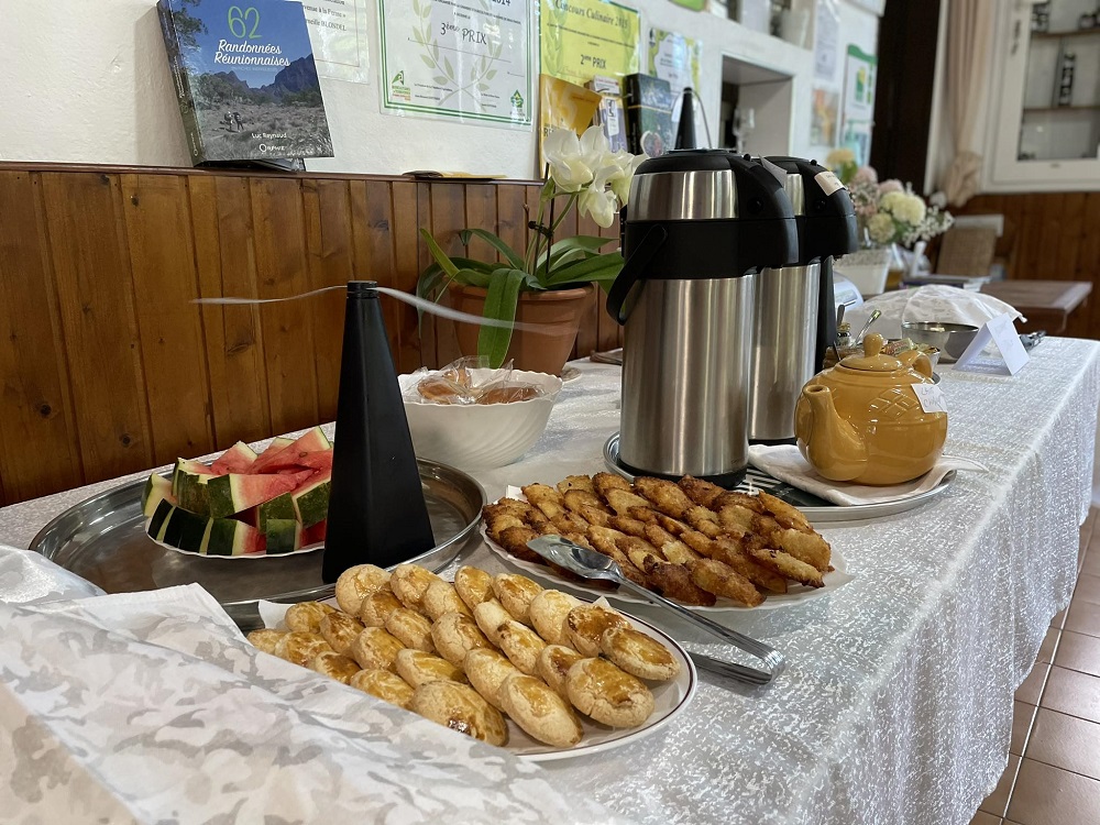 Liliane, la cheffe, régale les convives avec des spécialités telles que la mousse de patate douce à la goyave ou les petits gâteaux créoles. Ne manquez pas le petit déjeuner avec les délicieux gâteaux à la farine de rouroute faits maison !