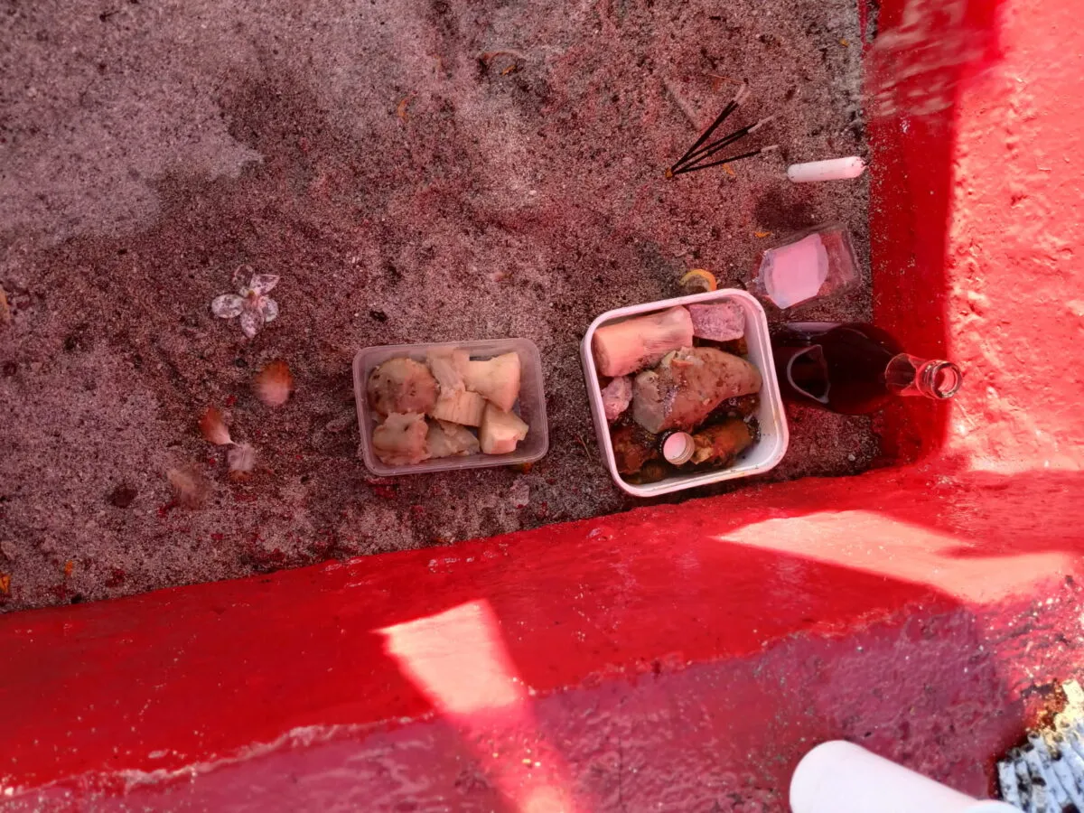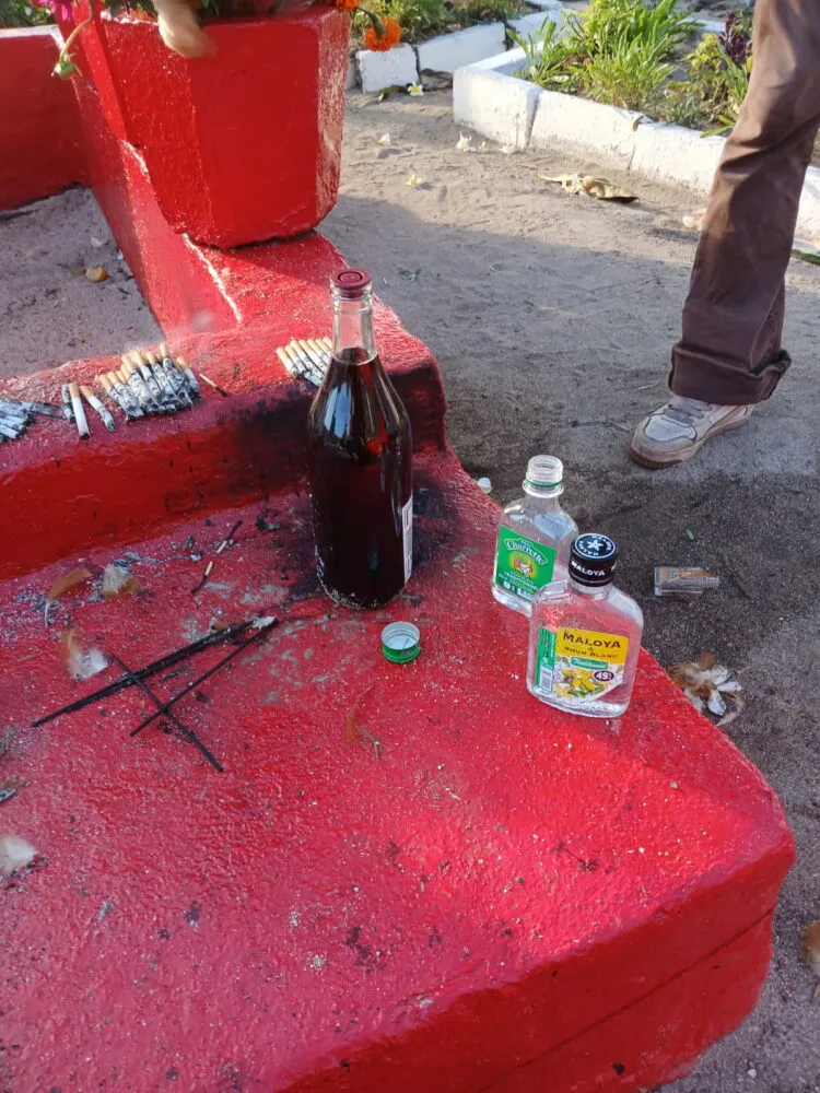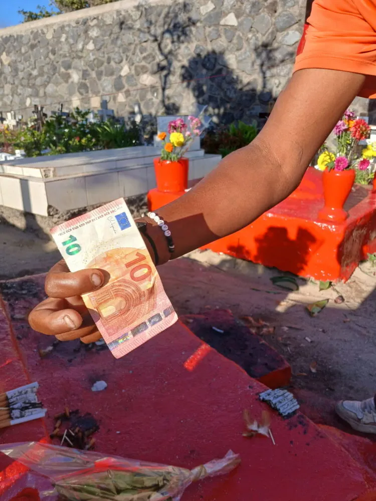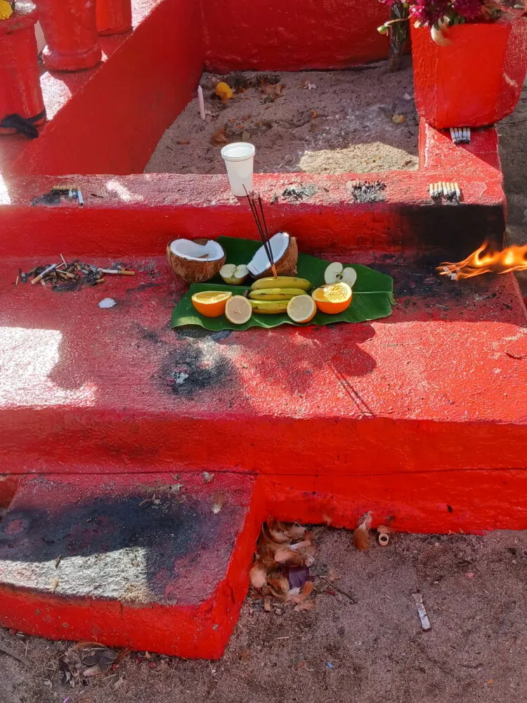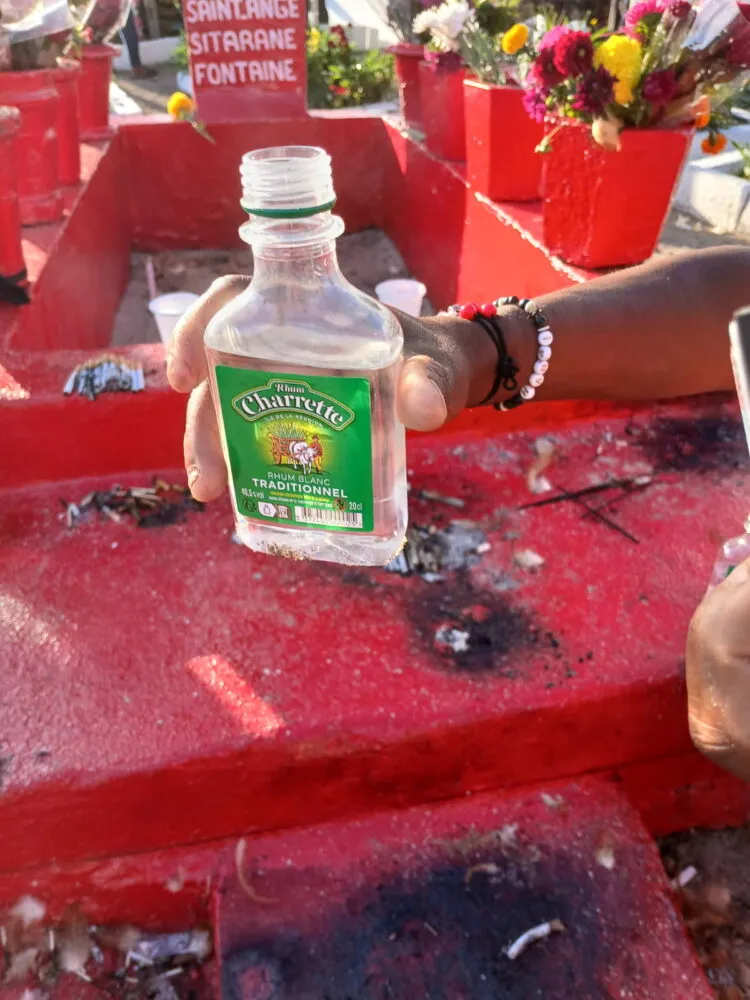 Sur la pierre rouge, au pied d’un frangipanier, s’accumulent fleurs, bougies, verres de rhum, lait, cigarettes, parfois même des photos ou des vêtements rouges. Ces objets symbolisent à la fois la recherche de protection et l’invocation d’un pouvoir, selon les croyances locales.