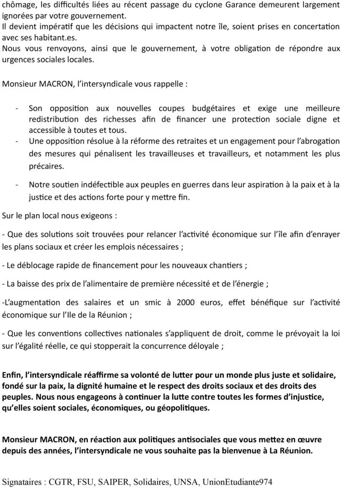 À l’approche de la visite présidentielle prévue la semaine prochaine à La Réunion, vous trouverez ci-jointe la lettre ouverte de l’intersyndicale adressée au Président de la République. Dans ce courrier, les organisations signataires expriment avec clarté et détermination leurs revendications face à une situation sociale jugée alarmante, et réaffirment leur opposition aux politiques actuelles.