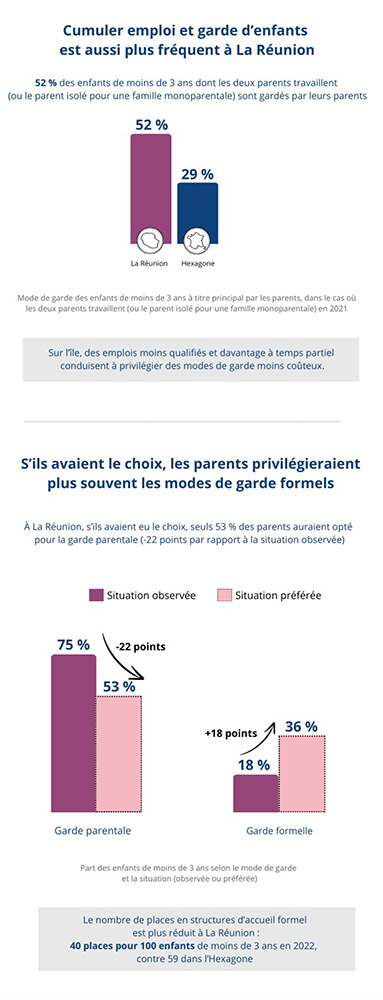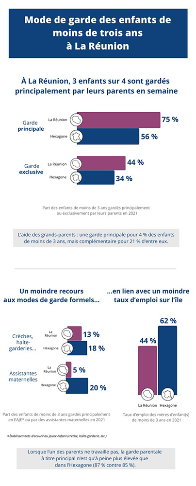 À La Réunion, 75 % des enfants de moins de trois ans sont gardés principalement en semaine par leurs parents, une part bien plus élevée que dans l’Hexagone (56 %). Les grands-parents sont aussi plus souvent en relais sur l’Île. A contrario, le recours à des modes de garde formels est moins courant.