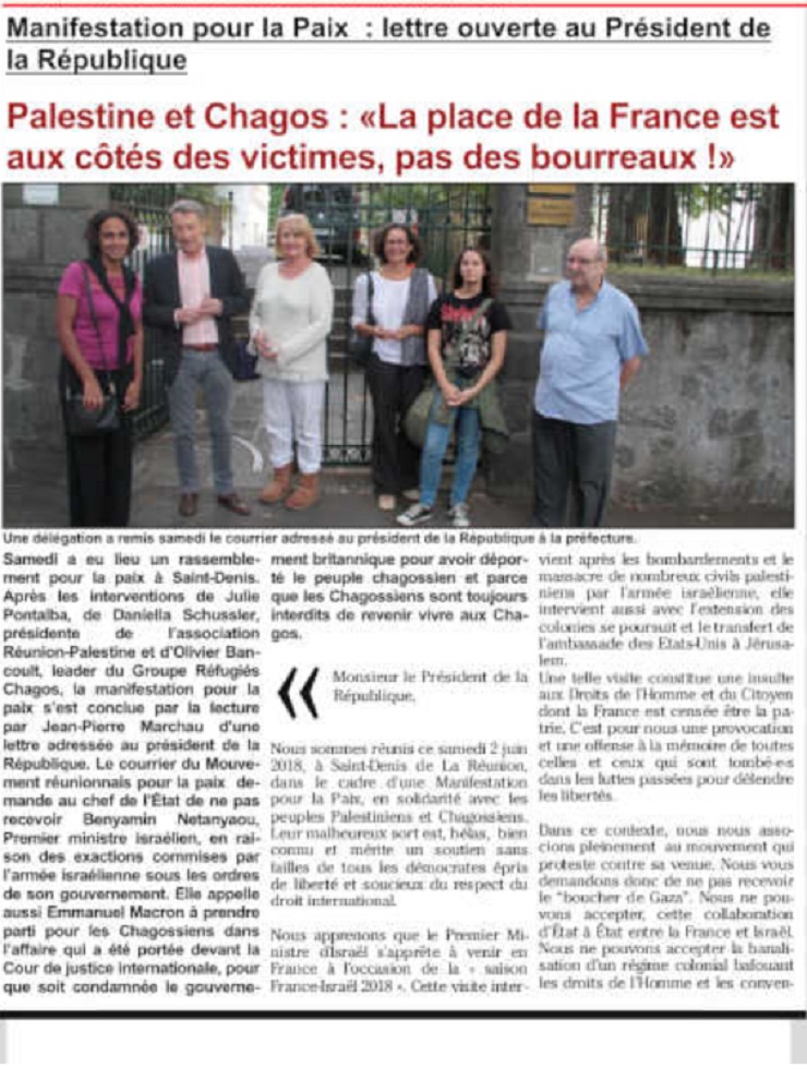 Le mouvement Réunionnais Pour la Paix a été fondé à la suite d’un rassemblement en soutien à la Palestine, le 2 juin 2018. A l’époque, au kiosque du Barachois, nous étions une cinquantaine de personnes à manifester. Nous avons adopté un texte pour demander au président français Emmanuel MACRON de ne pas recevoir le premier ministre israélien B. NETANYAHU. Une délégation a remis la lettre à la Préfecture (photo ci-jointe).