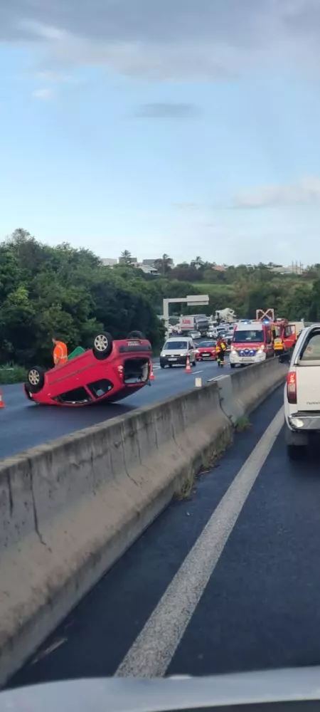 -Attention bouchons en direction de l’est, c’est bouché depuis le Verger !!! Un accident spectaculaire s’est produit vers 6H45 à la Ravine des Chèvres sur la quatre voies. Selon les premiers témoins qui ont appelé Free Dom, la conductrice aurait été extraite de l’habitacle par les secours, elle est consciente et prise en charge par des ambulanciers sur site.
