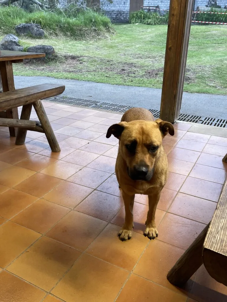 À Bourg Murat cette chienne nous a suivis à 6h30 sortant de la caserne du RSMA. Elle nous a suivis jusqu’au gîte de Belouve où nous sommes ce soir. C’est une jeune chienne pleine d’énergie, autonome mais aimant la compagnie. Elle n’a ni collier ni tatouage.