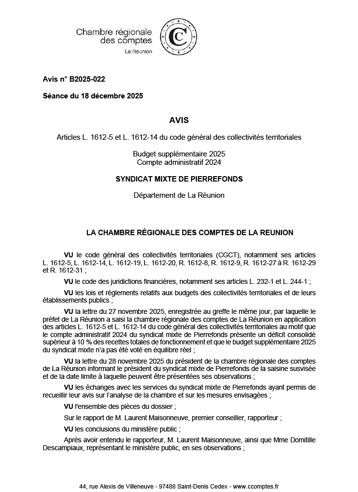 La Chambre régionale des comptes de La Réunion a rendu public, le 18 décembre 2025, un nouvel avis particulièrement sévère sur la situation financière du syndicat mixte de Pierrefonds, gestionnaire de l’aéroport du même nom.