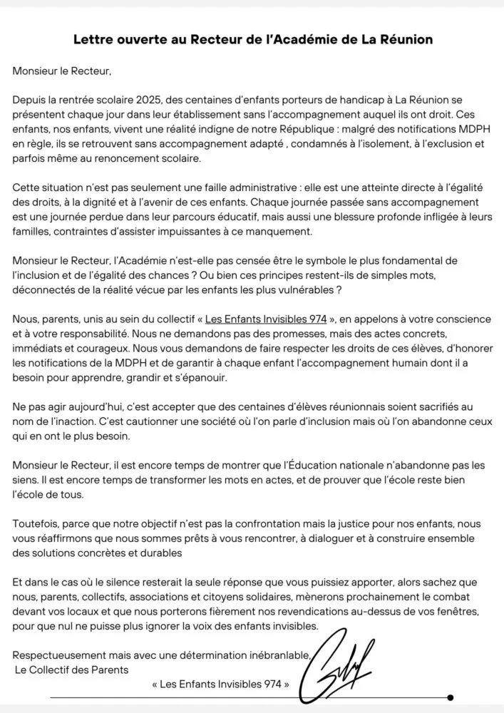 Dans une lettre ouverte adressée au Recteur de l’Académie de La Réunion, le collectif « Les Enfants Invisibles 974 » décrit le quotidien de centaines d’enfants laissés sans accompagnement malgré leurs droits, parlant d’« isolement », d’« exclusion » et de familles contraintes de « renoncer à l’école ».