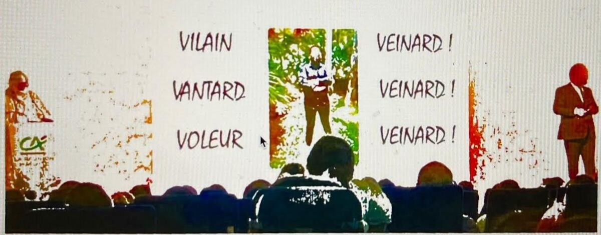 Sur l’image en question, il est montré un homme de type « malbar », les bras croisés. Y figurent également, sur la colonne de gauche, les qualificatifs écrits noir sur blanc : « voleur, vantard, vilain ». Puis, sur la colonne de droite, il est inscrit « veinard » en trois fois. On voit sur cette même image le directeur général Didier Grand « dans une tenue blanche particulière » s’exprimant sur la projection.