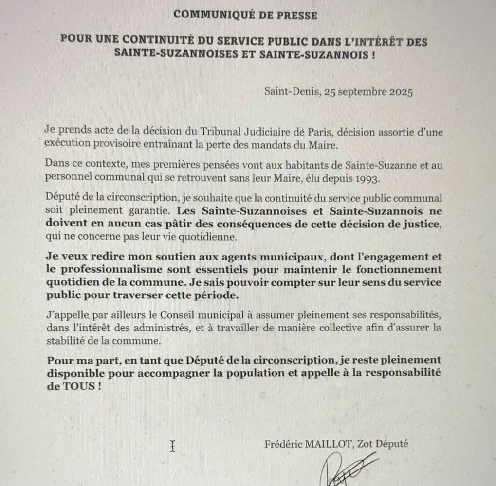 Voici la réaction du député de la 6ème circonscription, Frédéric Maillot (PLR) qui se dit « pleinement disponible pour accompagner la population de Sainte-Suzanne » :