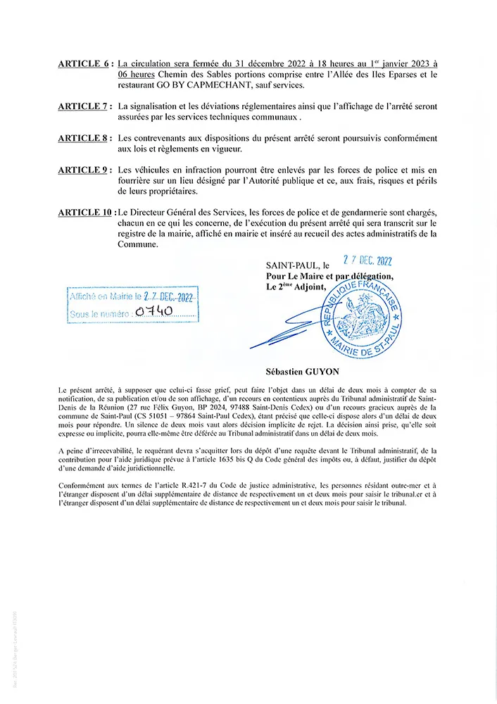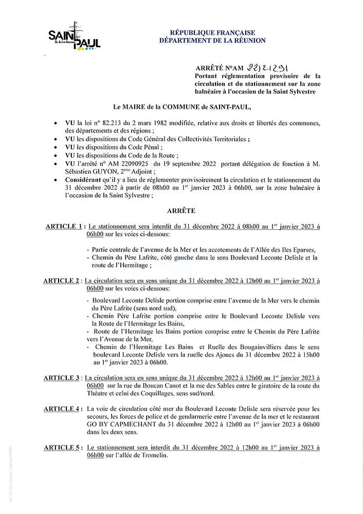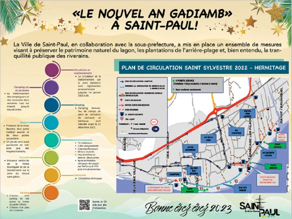 Le Réveillon de la Saint-Sylvestre approche à grand pas ! Afin de permettre le bon déroulement du Réveillon sur les plages de l’ouest, la Ville de Saint-Paul en collaboration avec la sous-préfecture, a mis en place un ensemble de mesures visant à préserver la sécurité et la tranquillité publique, le patrimoine naturel du lagon et les plantations de l’arrière-plage.