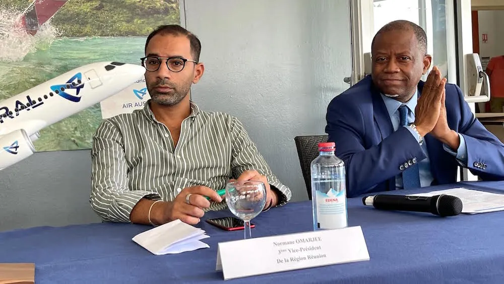 De gauche à droite : Normane Omarjee, vice-président de la Région, qui a porté ce dossier et Joseph Bréma, Pdg par intérim de la compagnie, lors du retour d’Air Austral à Pierrefonds (depuis Maurice) grâce aussi à André Thien-Ah-Koon. Ce qui n’était plus le cas depuis ces quelques dernières années. Pour info, Joseph Bréma devrait sans doute garder son poste de Pdg suite à la restructuration de la compagnie. (Photo Y.M)