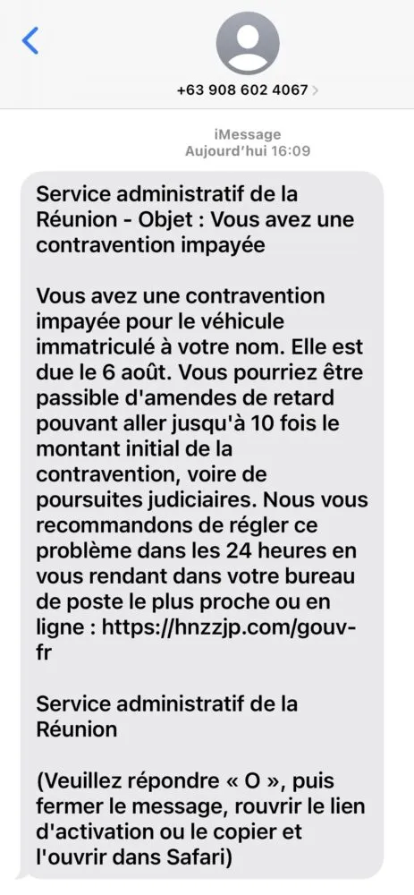 Depuis plusieurs jours, des usagers à La Réunion reçoivent de prétendus messages du « Service administratif de la Réunion » leur signalant une contravention impayée. Le SMS mentionne une amende supposée pour un véhicule immatriculé au nom du destinataire et menace de lourdes pénalités ou de poursuites judiciaires en cas de non-paiement sous 24 heures. Un lien frauduleux renvoyant vers un faux site gouvernemental est également intégré. Ce type de tentative d’arnaque par hameçonnage vise à récupérer des données personnelles ou bancaires.