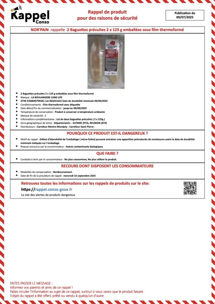 Un rappel de produit vient d’être émis concernant des baguettes précuites de la marque « La Boulangère Long Life », distribuées à La Réunion. Il s’agit de lots de 2 baguettes de 125 g conditionnées sous film thermorformé, dont la date de durabilité minimale est fixée au 09 septembre 2025. La procédure de rappel est en vigueur jusqu’au 10 septembre 2025