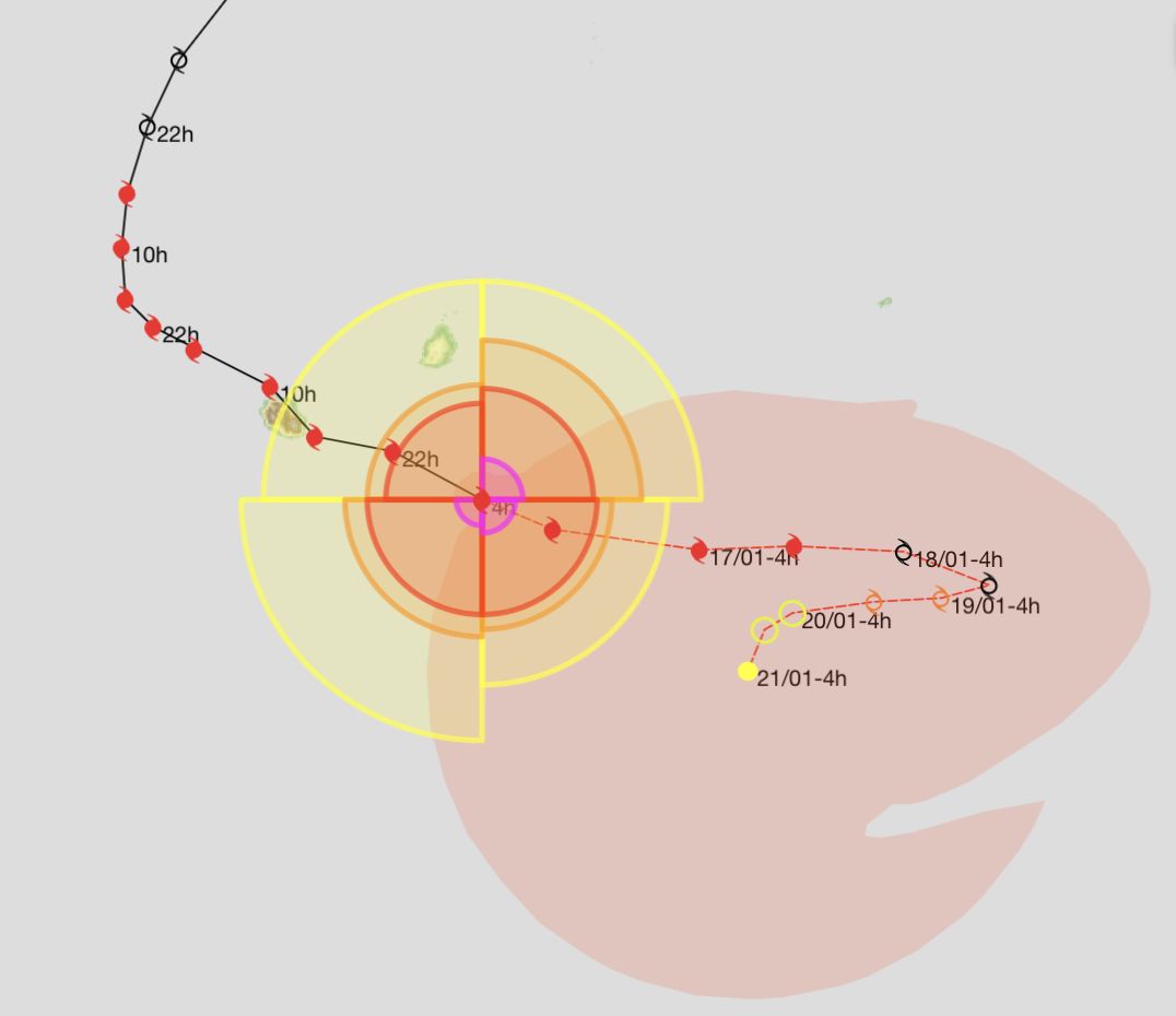 Centre positionné le 17/01 à 04h locales, par 22.8 Sud / 61.0 Est.