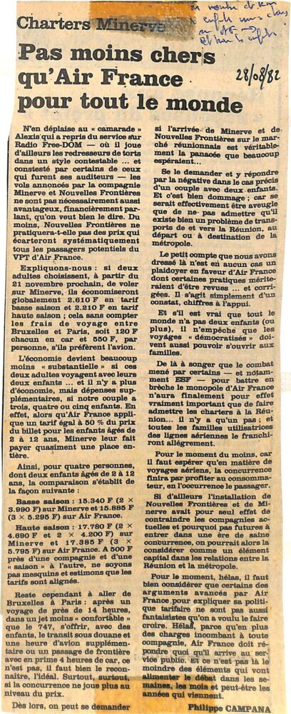 1982 Alexis commence à agacer par La Rédaction 28 août 1982 1 min de lecture « N’en déplaise au camarade Alexis qui a repris du service sur Radio Free Dom, où il joue d’ailleurs les redresseurs de torts dans un style contestable… » (Philippe Campana JIR) Ne manquez pas toute l’actualité de La Réunion ! Abonnez-vous à la newsletter de Free Dom ! Valider Partager Facebook Twitter Pinterest Linkedin Whatsapp Reddit Email Vous pourriez être intéressé par 10 décembre 1982 Un canular par jour sur Radio Free Dom 11 octobre 1982 L’émission « pas de canard sans navet » 7 octobre 1982 L’émission « bleu outre-mer ou la radio de la méduse… » La Rédaction Laisser un commentaire Annuler la réponseYour email address will not be published. Enregistrer mon nom, mon e-mail et mon site dans le navigateur pour mon prochain commentaire. Current ye@r * Leave this field empty Article précédent Premiere critique de l’émission « chaleur tropicale » (télé 7jours) Article suivant Interview de Benjamin Virapin (Radio Détente N°1) Articles récents... Hommage à Johnny Hallyday sur Free Dom 2 ce 5 décembre Mardi 30 décembre 2025 – Météo, éphéméride et horoscope du jour Saint-Joseph : découverte de 2337 plants de cannabis, arrestation de 2 individus Point sur le réseau routier départemental, 29 décembre à 16H30 Suicide sur le pont de la Rivière d’Abord : importante mobilisation des secours et des forces de l’ordre Radier submergé à Ilet Furcy : la route de Cilaos fermée à la circulation cette nuit Fortes pluies : appel à la plus grande prudence à Saint-Paul Saint-Gilles-les-Bains : une route impraticable, les riverains montent au créneau (VIDEOS) Très grands excès de vitesse : un délit passible de prison depuis le 29 décembre 2025 Fermeture temporaire du sentier de la Canalisation des Orangers (cirque de Mafate)