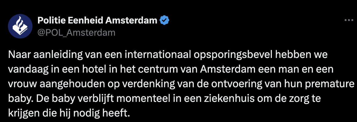 Dans la soirée, la police néerlandaise a confirmé l’arrestation des parents, suspectés de l’enlèvement de leur bébé prématuré, via un communiqué. Le nourrisson a été transféré à l’hôpital pour y recevoir les soins nécessaires.