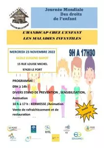 Participez à la journée d’animation et de sensibilisation ce mercredi 23 novembre à l’école Eugène Dayot à la Rivière des Galets. Plusieurs stands seront installés afin de vous informer sur les droits de l’enfant et particulièrement sur ‘le handicap chez l’enfants et les maladies infantiles’. Des animations et une kermesse sont aussi au programme. Ces activités sont proposées par le Centre culturel Farfar avec le soutien de plusieurs partenaires dont la ville du Port dans le cadre de la journée internationale des Droits de l’Enfant (Nations Unies) et la journée mondiale de défense et de promotion des droits de l’enfant (France, 1996) du 20 novembre.